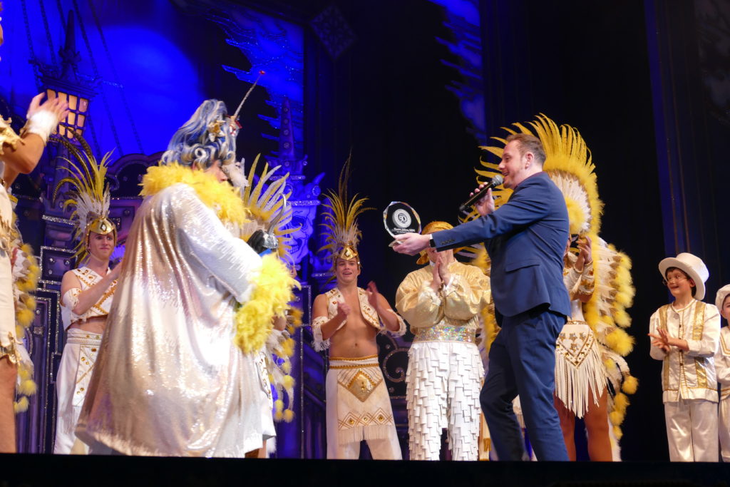 Cyflwynwyd ei wobr iddo ar lwyfan Theatr y Grand lle’r oedd yn serennu fel hen wreigan panto am yr 21 blwyddyn yn olynol.