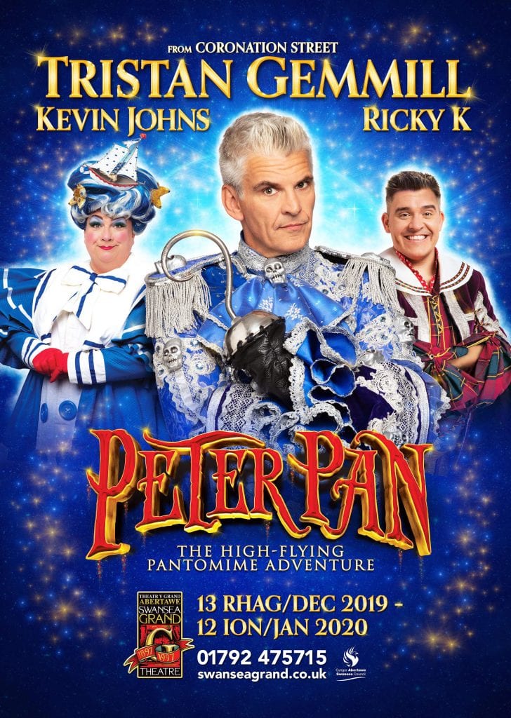 Bydd Peter Pan yn dod i Theatr y Grand Abertawe gyda Tristan Gemmill o Coronation Street yn chwarae rhan Capten Hook, ffefryn Abertawe Kevin Johns yn chwarae rhan Mrs Smee, seren Britain’s Got Talent, Ricky K yn chwarae rhan Starkey ac Aoife Kenny yn chwarae rhan Tiger Lily.